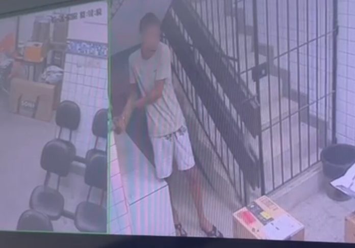 Câmeras de segurança registraram o momento em que o suspeito, aguardando a distração dos policiais, remove a algema do braço direito e sai da delegacia andando calmamente.