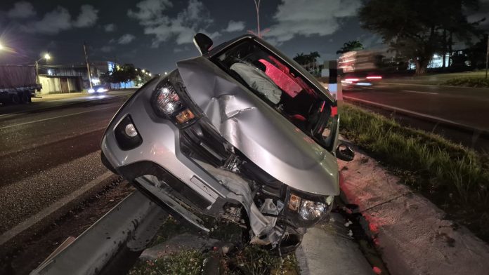Um carro de passeio invadiu o canteiro central da BR-101, no bairro da Cidade Universitária, no Recife, e ficou preso à defensa metálica após o motorista perder o controle da direção. O acidente ocorreu por volta das 20h45 desta terça-feira (13), no sentido Paulista, na altura do Km 68.