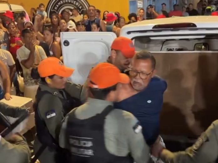 Imagens que circulam nas redes sociais mostram o momento em que o homem discute com um policial militar, que o puxa e o imobiliza. No vídeo, o vendedor está ao lado de um furgão com as portas traseiras abertas, onde havia uma caixa térmica e uma placa com preços de bebidas. O veículo não aparentava ter autorização para comercialização no local.