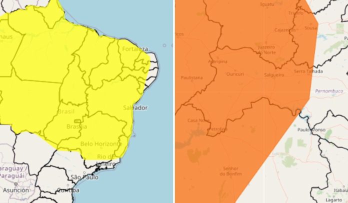 Um dos alertas, de nível amarelo, segue até esta quarta-feira (25). De acordo com o órgão, são esperadas chuvas de até 50 milímetros por dia nessas regiões, além de áreas extensas do Nordeste, Norte e Centro-Oeste do país. Paralelamente, o Inmet também publicou um alerta laranja, válido até as 10h desta terça-feira (24), indicando volumes mais intensos, entre 50 e 100 milímetros, acompanhados de ventos que podem chegar a 100 km/h.